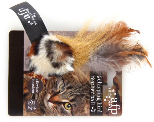 AFP Chirping Bird Feather Ball Cat Toy This feathery toy boasts a cleverly concealed sound chip, emitting bird song when activated for even more intrigue and excitement! Stirring your cat's natural feline instincts, they can enjoy hours chasing, playing and tossing this soft ball. This toy measures approx. 5" x 4" x 1"